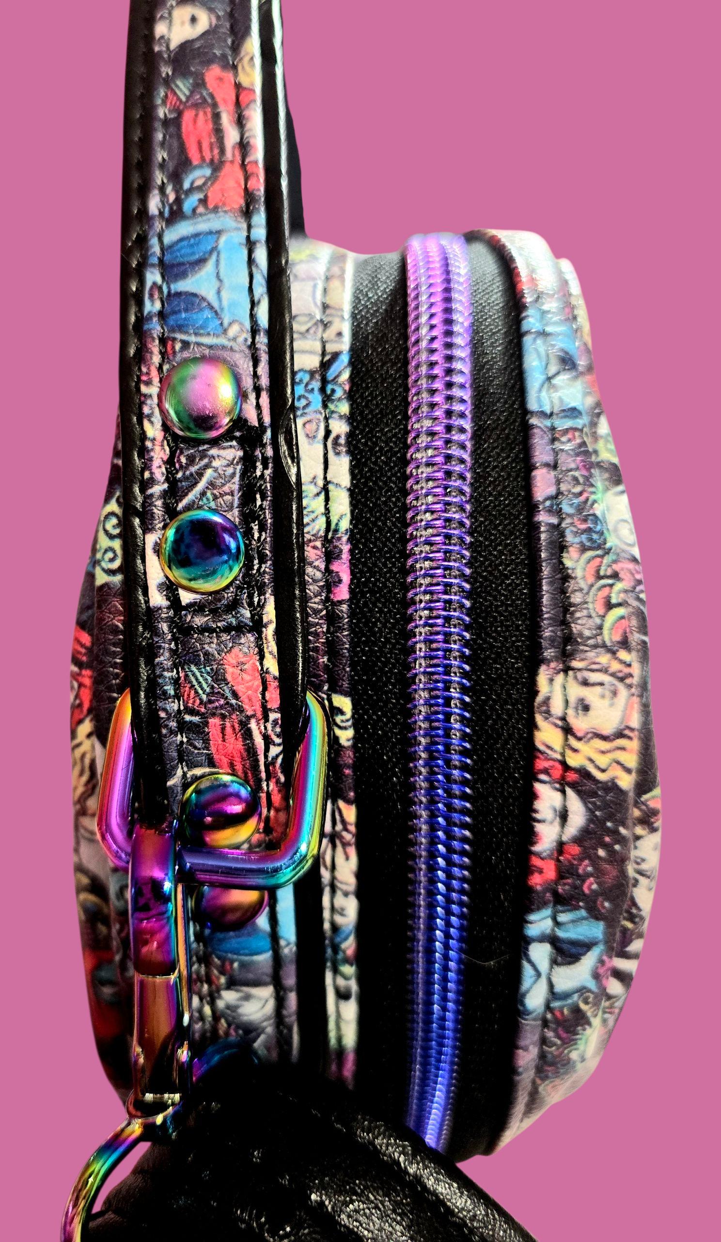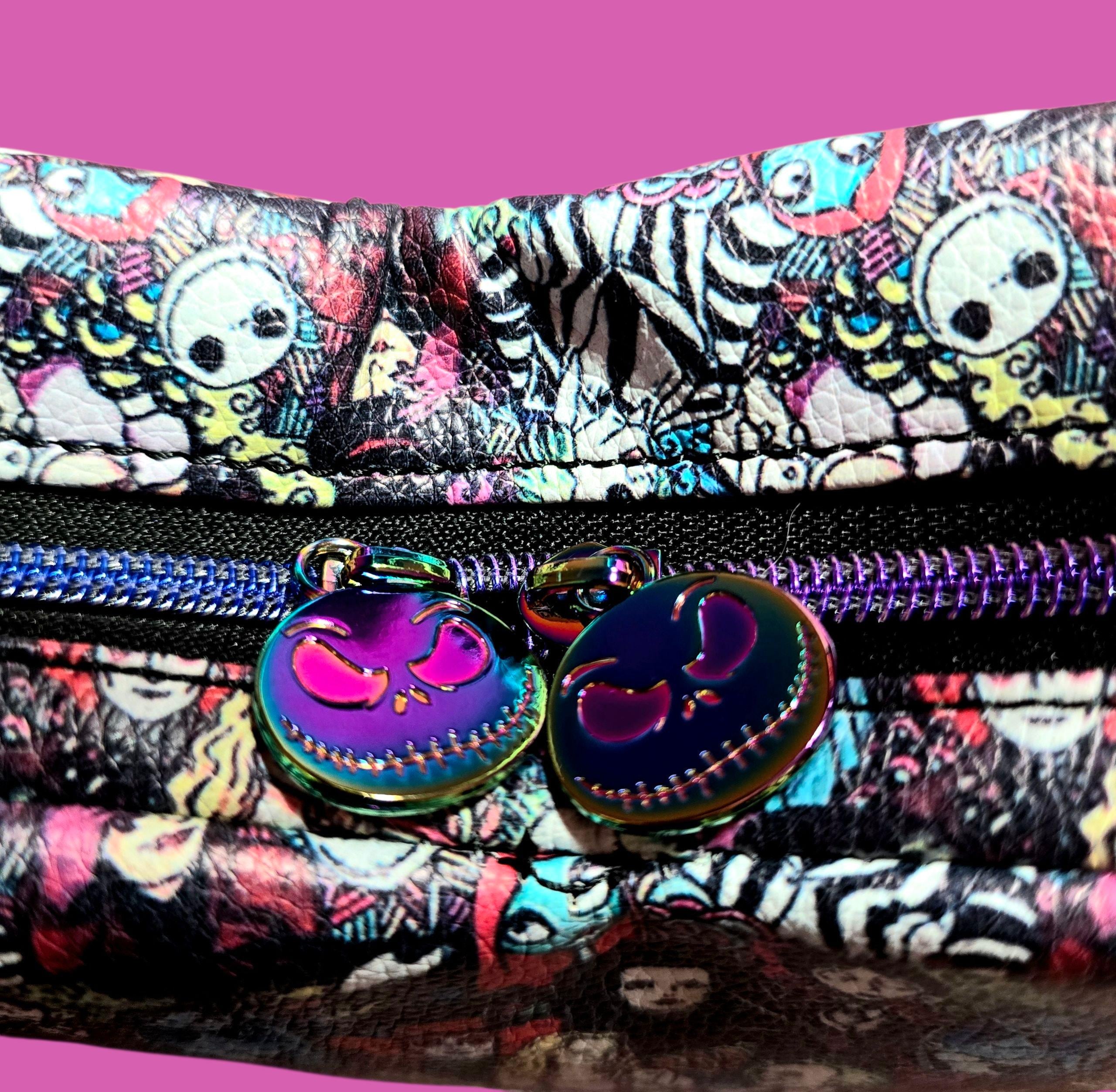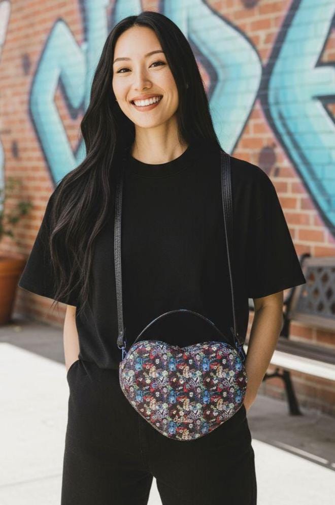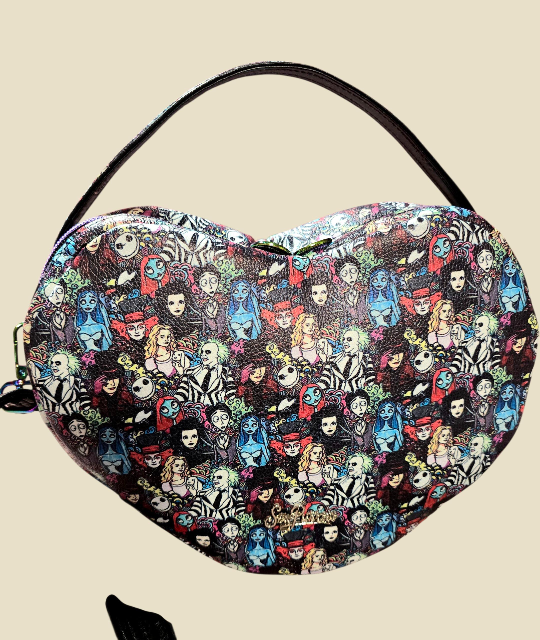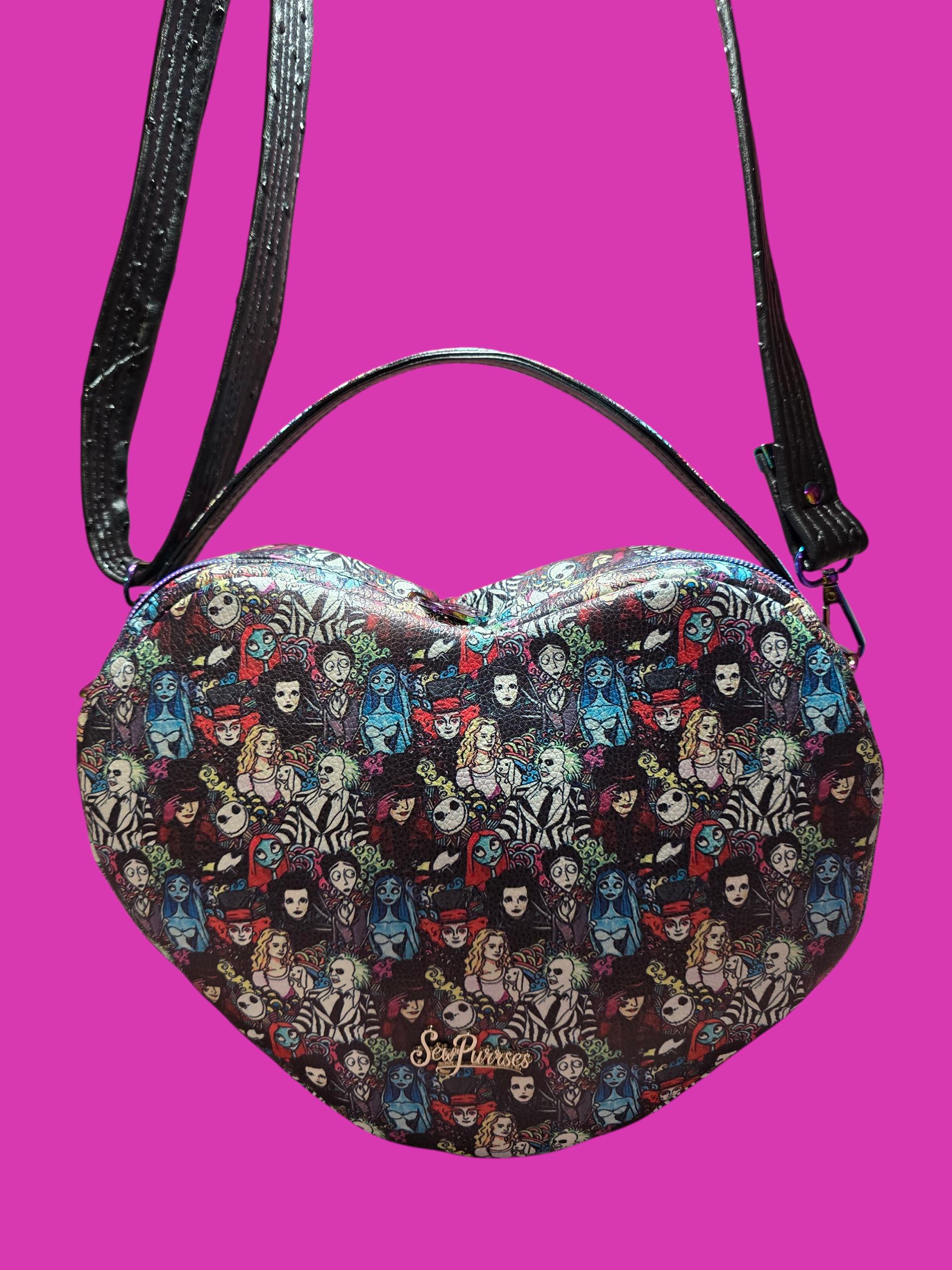 Fall in love with the strange and unusual. Our **Tim Burton–Inspired Heart Crossbody Bag** is a handmade tribute to gothic romance, eerie elegance, and Burtonesque charm. Shaped like a heart and crafted from luxe faux leather, this bag channels the spirit of beloved characters and twisted fairytales.
