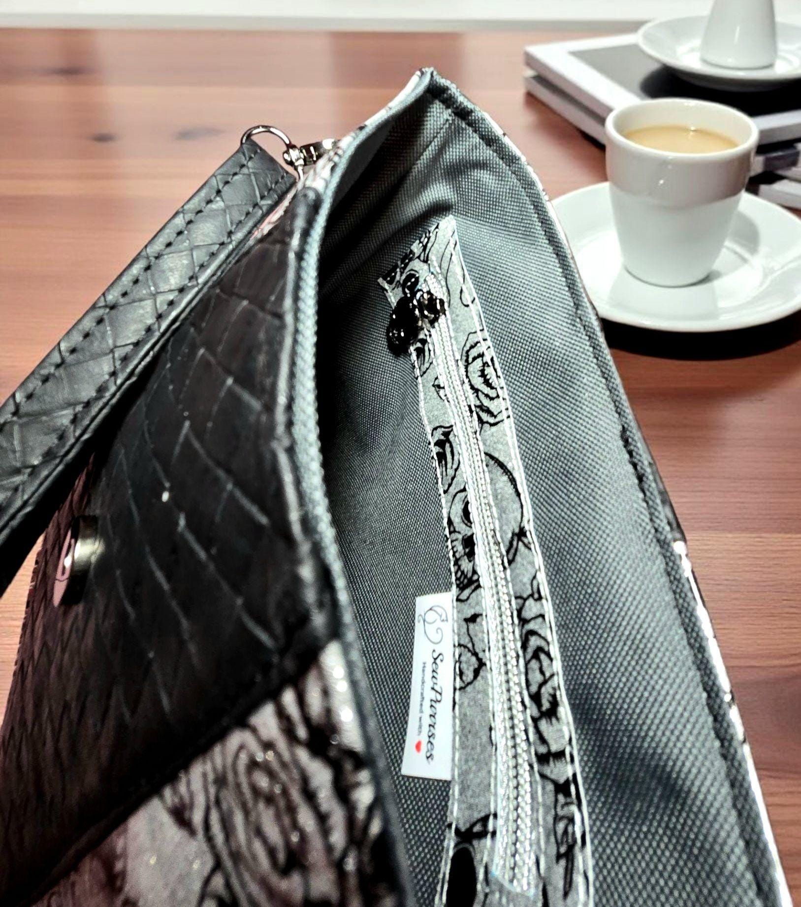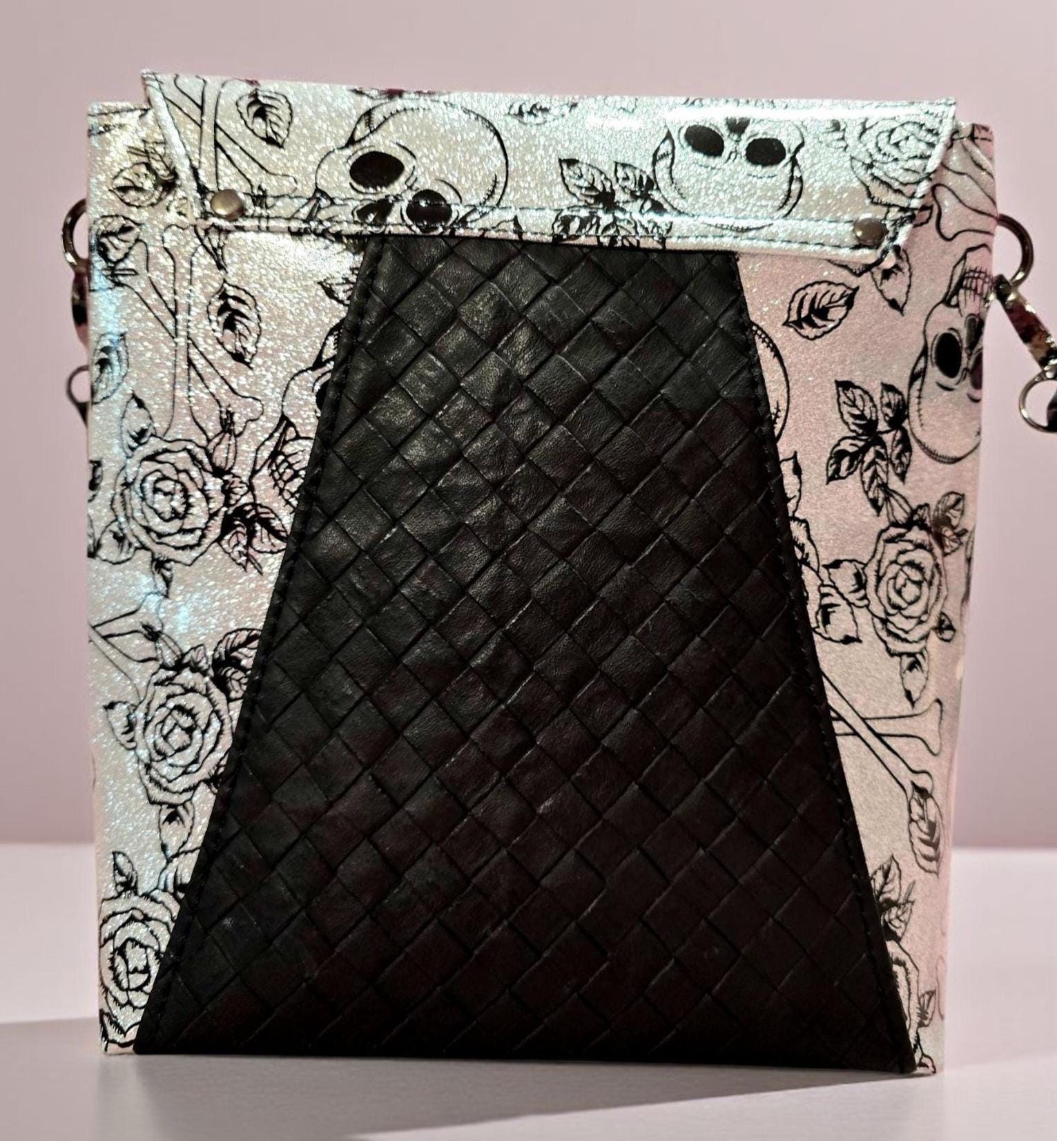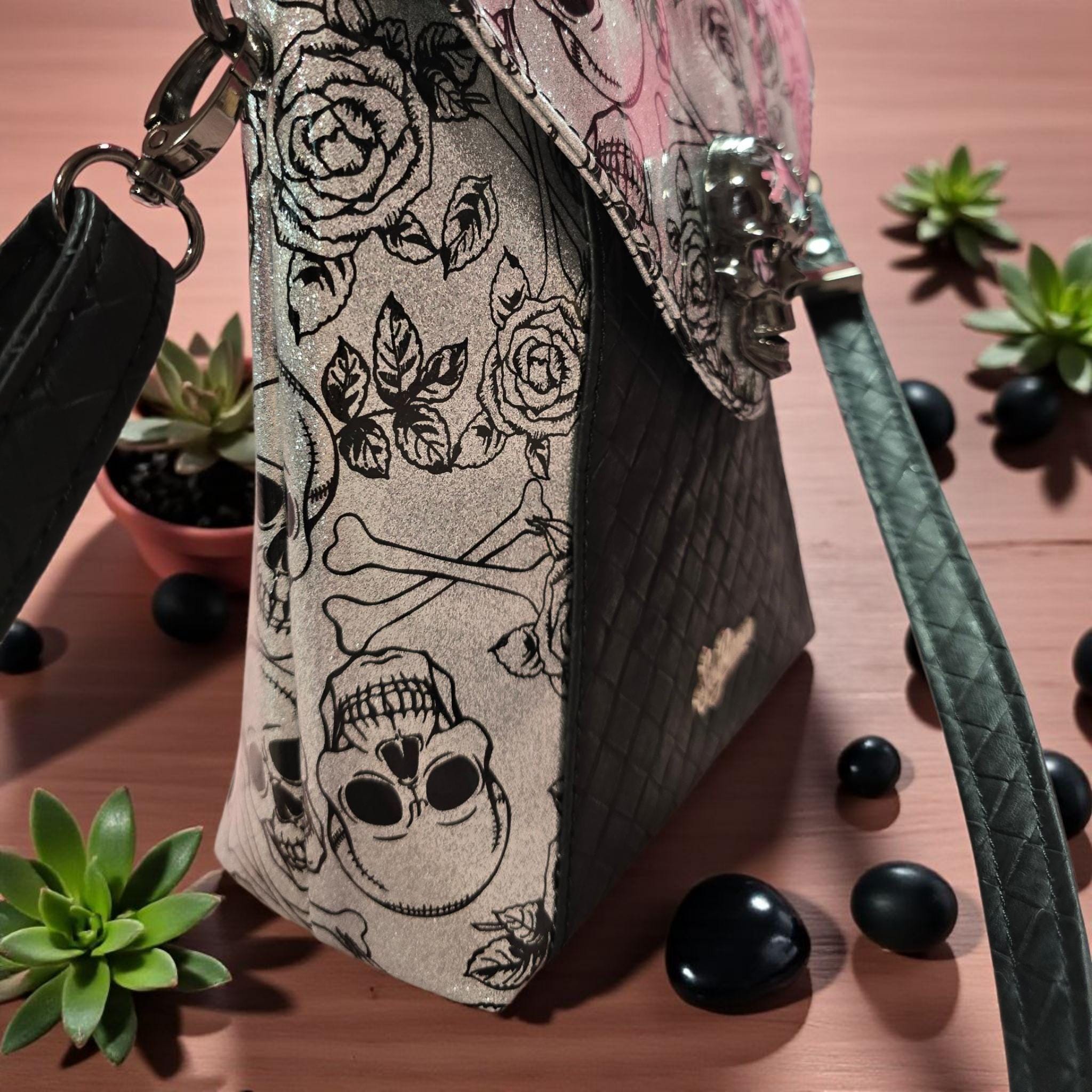 🖤 Handmade Silver with Black Skulls Print Crossbody Bag. This edgy yet elegant crossbody bag is handcrafted for those who embrace bold style with a touch of rebellion. Featuring a striking black skull and roses against a glittery silver background., this bag blends gothic charm with everyday functionality.